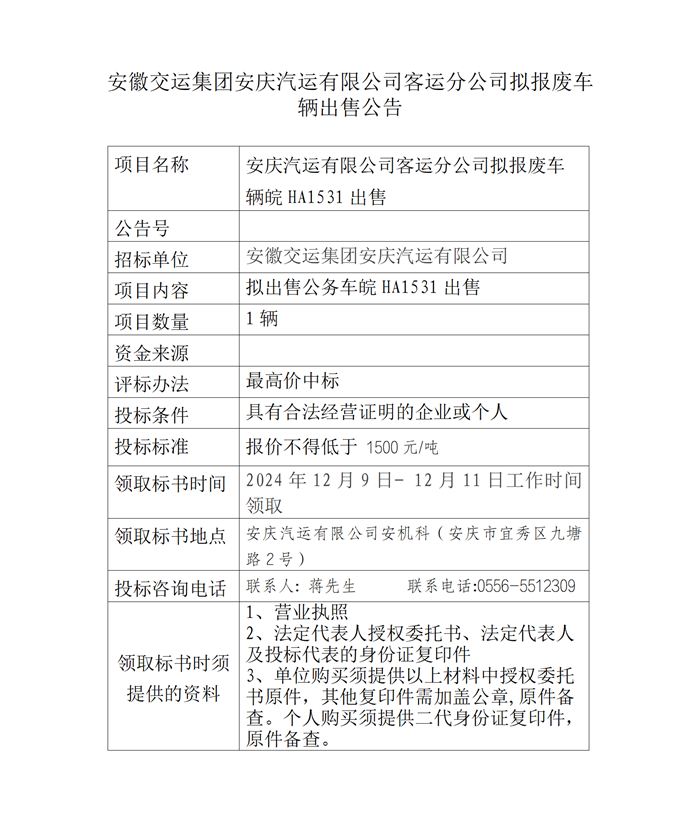 安慶汽運(yùn)有限公司客運(yùn)分公司擬報(bào)廢車輛出售公告